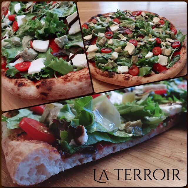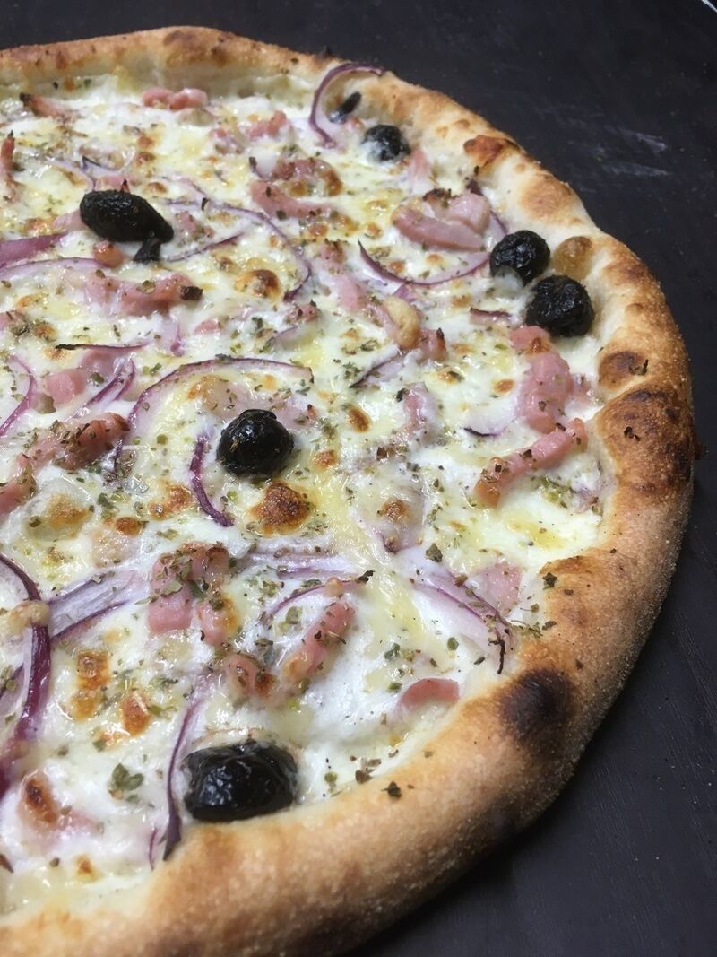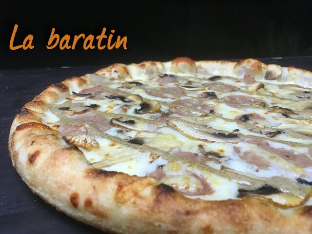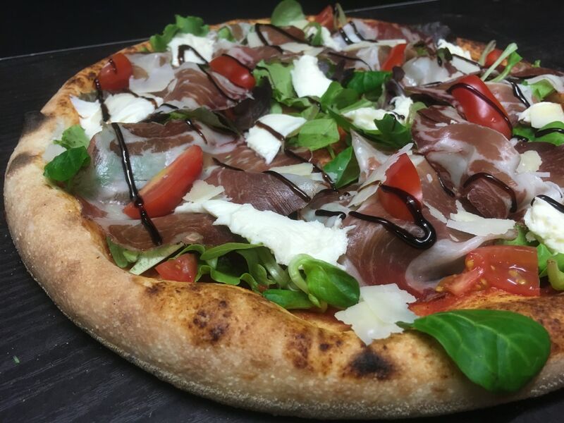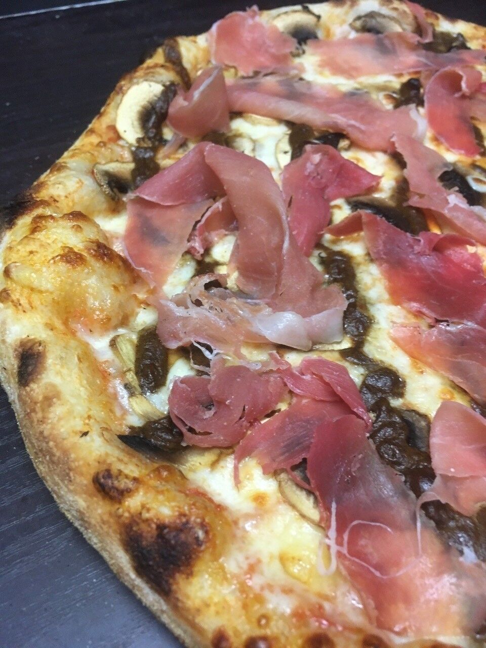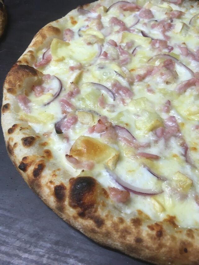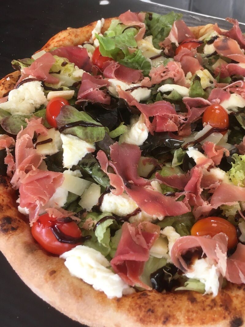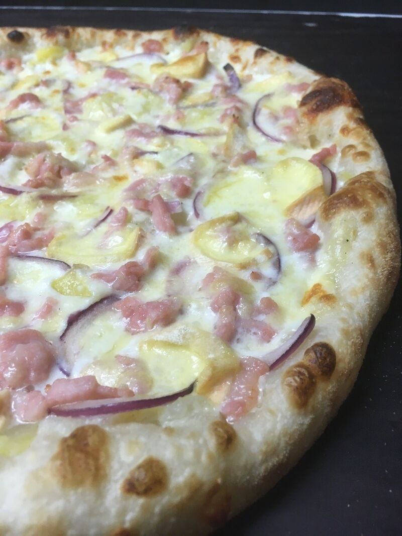 LA DAUPHINOISE Base tomate, crème fraîche aux cèpes, mozzarelle, raviole au comté, jambon cru